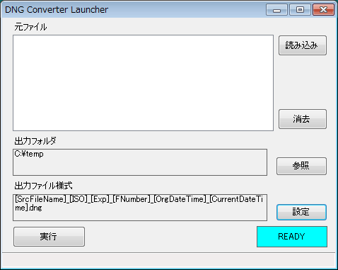 Adobe DNG Converter自身でもGUIのフロントエンドはありますが、あえて別のフロントエンドを作成した目的は、作成したファイル名にISO感度や露出時間などを付加することにより後続の処理を行いやすくするためです。